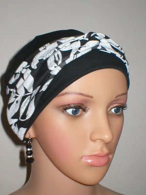 Black jersey hat with black / white leaf coloured wrap . Soft cotton jersey material. One size, easy and quick to put on. cool wash, do not tumble dry. Only one of this colour in stock