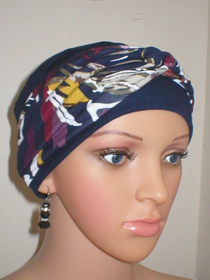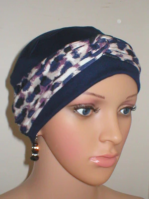 Navy jersey hat with a navy lily coloured wrap . Soft cotton jersey material. One size, easy and quick to put on. cool wash, do not tumble dry. Only one of this colour in stock