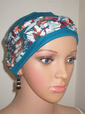 Teal jersey hat with a Teal pansy coloured wrap . Soft cotton jersey material. One size, easy and quick to put on. cool wash, do not tumble dry. Only one of this colour in stock